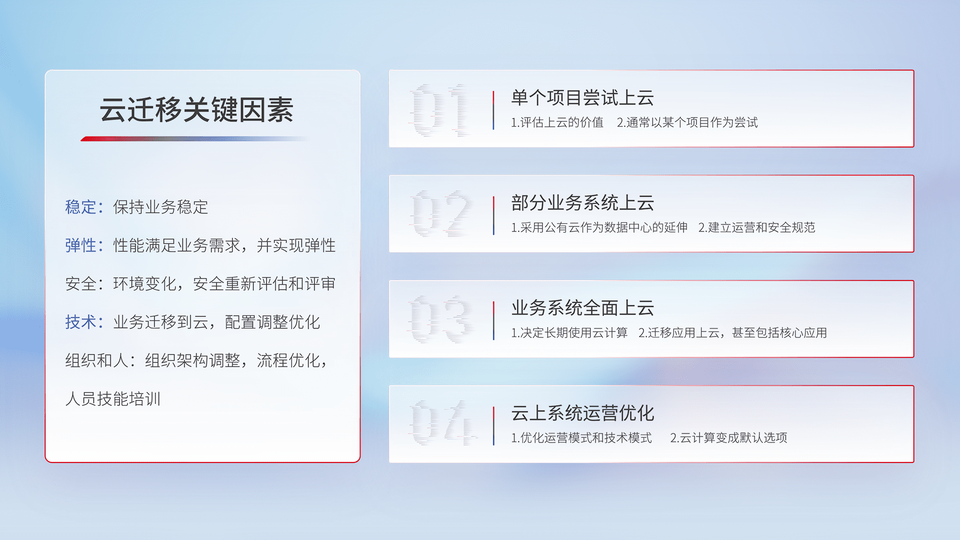 结合实际业务,,从规划设计、、云平台选型、、、、云原生改造、、、数据迁移、、集成交付,,,迁移全过程为客户识别最佳上云路径,,做好风险识别管理,,设计网络架构、、、、身份权限、、安全审计合规、、、、操作审计、、、日志审计、、、、监控告警策略、、、、多站点容灾设计等,,对云上基础设施进行整体规划,,,提升IT治理水平,,,,以满足弹性、、、、高可用、、、高性能的需求。。。