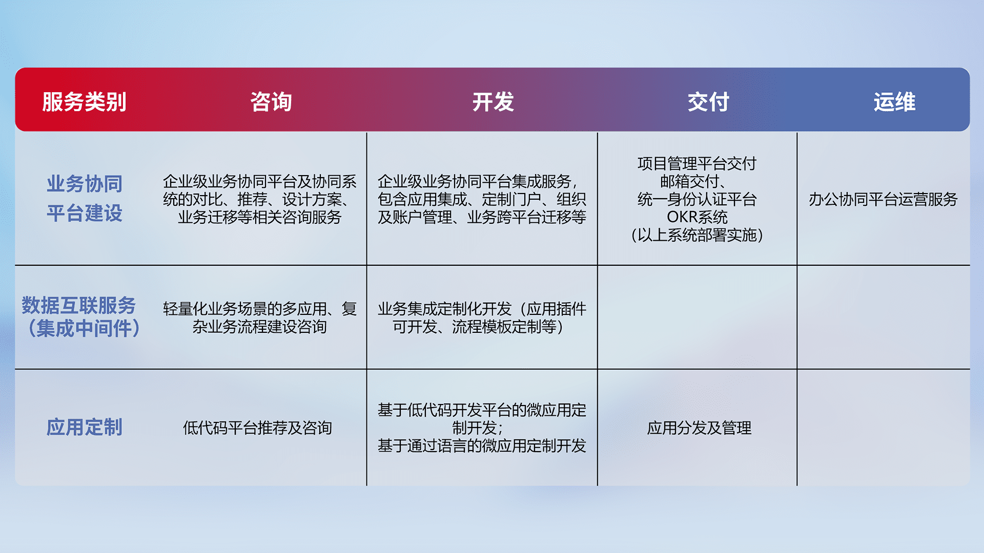 针对钉钉、、、、企微、、、IDaas等平台级产品提供产品的规划、、方案、、、、交付、、、、定制化开发等服务,,,,实现如统一协同办公、、智能客户服务、、、混合会议管理、、、、智能数据查询、、、等业务场景,,,实现数字化转型。。。
